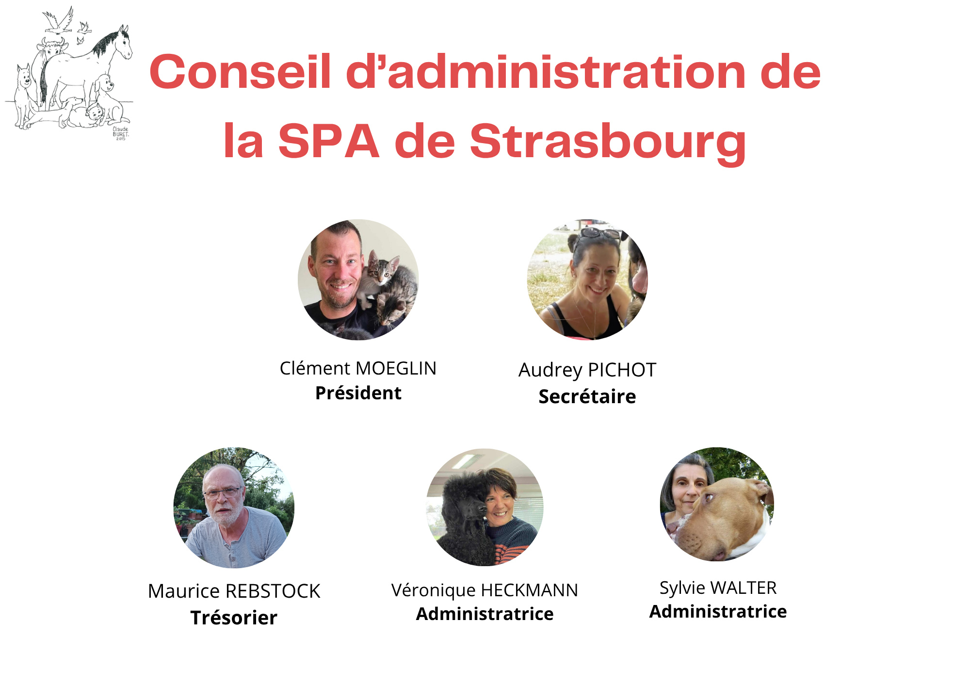 Vous trouverez ci-dessous les membres du nouveau Conseil d'Administration élu en mai 2023. Ces membres ont pour tâche de gérer et d'administrer le refuge animalier de la SPA de Strasbourg pour 3 ans.